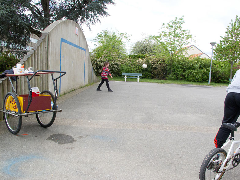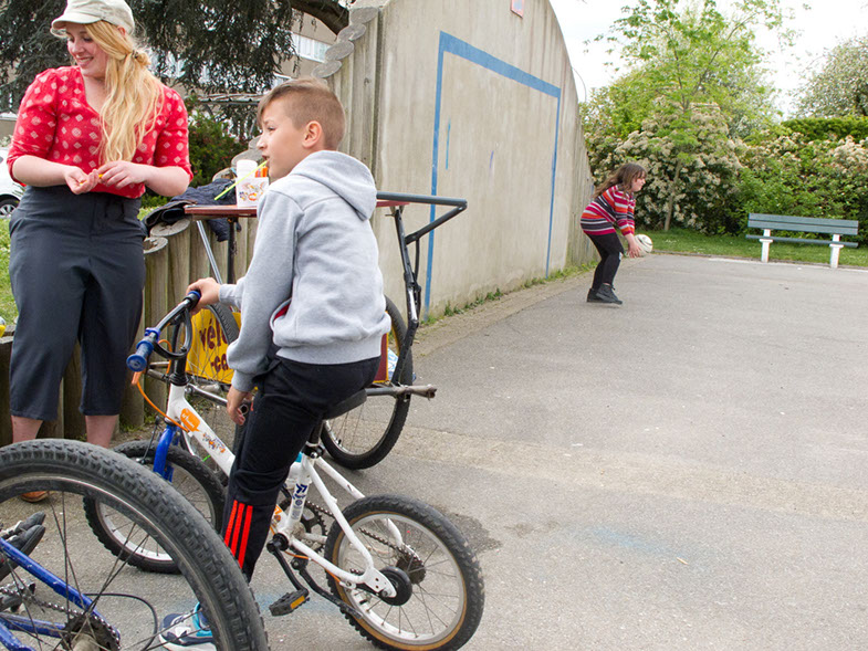Les Kaps de Bellevue et leur vélo-café en visite aux Bourderies, printemps 2015.