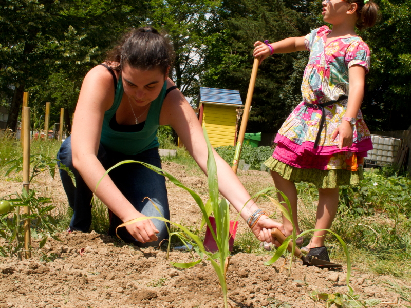 Mettre des tuteurs aux tomates : l’activité absorbe l’animatrice comme la fillette