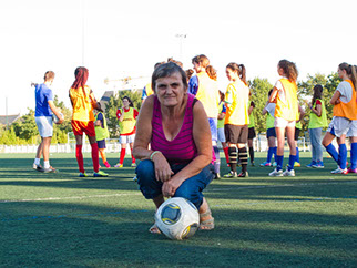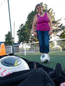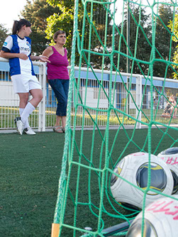 Au stade de la Durantière, Christine discute foot avec la coach de l’équipe de Rezé, Manuela Guilloux