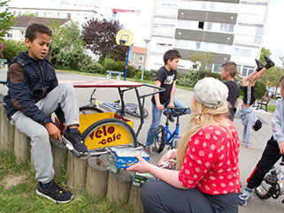 Les Kaps de Bellevue et leur vélo-café en visite aux Bourderies, printemps 2015.