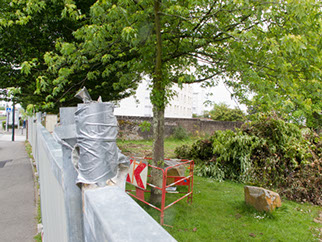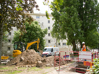 Devant l’immeuble « abbé Pierre », les travaux s’engagent. Bientôt plus d’arbres devant les fenêtre de ses habitant.es !