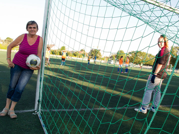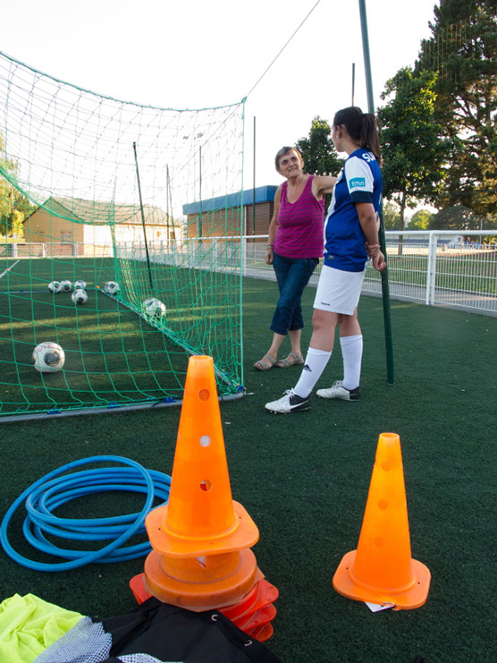 Au stade de la Durantière, Christine discute foot avec la coach de l’équipe