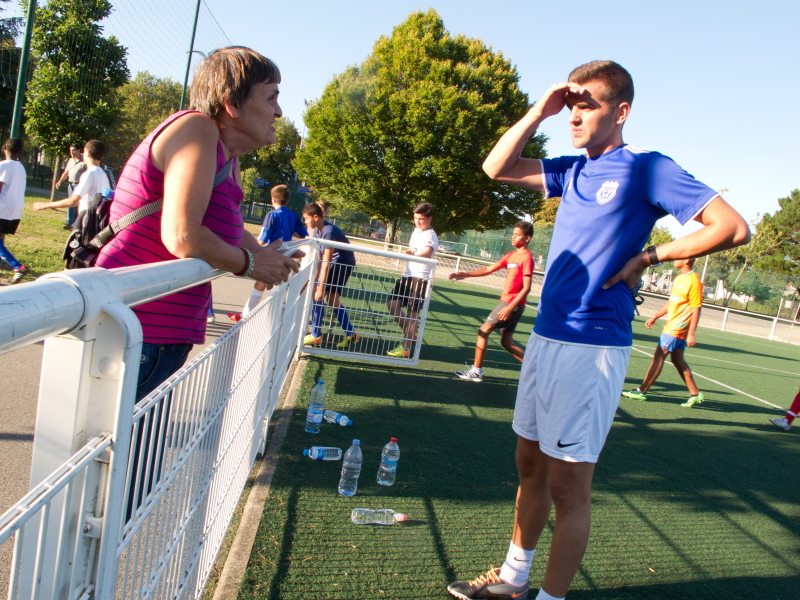 Christine discute foot avec Cédric Bréchet, un des entraineurs des footballeuses