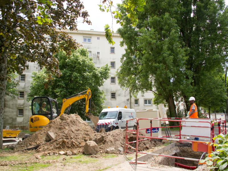 Devant l’immeuble « abbé Pierre », les travaux s’engagent. Bientôt plus d’arbres devant les fenêtre de ses habitant.es !