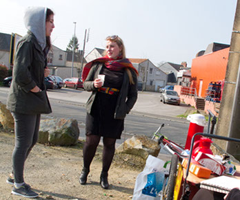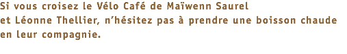 Elles vivent en colocation à Bellevue, en face de la place des Lauriers. En tant que kapseuses, elles s’investissent dans un projet solidaire. Elles ont choisi le Vélo Café. C’est-à-dire ? Munies d’une bicyclette tirant un chariot qui transporte thermos d’eau chaude, thé, café, sucre et petits gâteaux, elles s’installent dans
